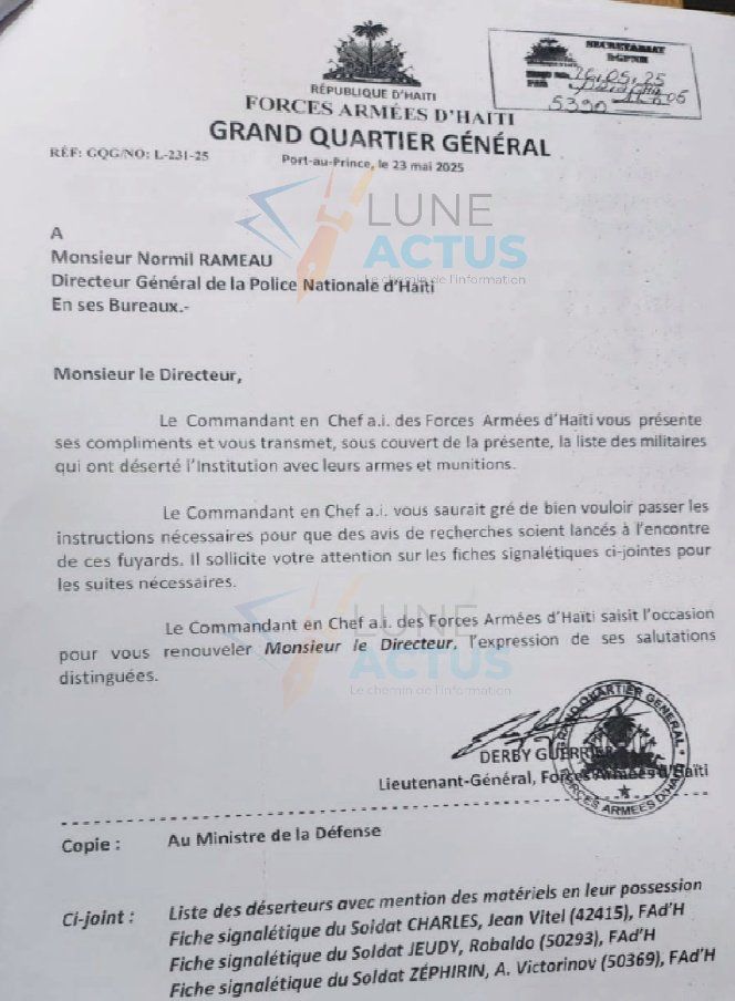 La lettre du Général Derby Guerrier, accompagnée des fiches signalétiques des déserteurs, exhorte le commandant en chef de la PNH à lancer des avis de recherche urgents pour localiser ces individus et récupérer l’équipement militaire.